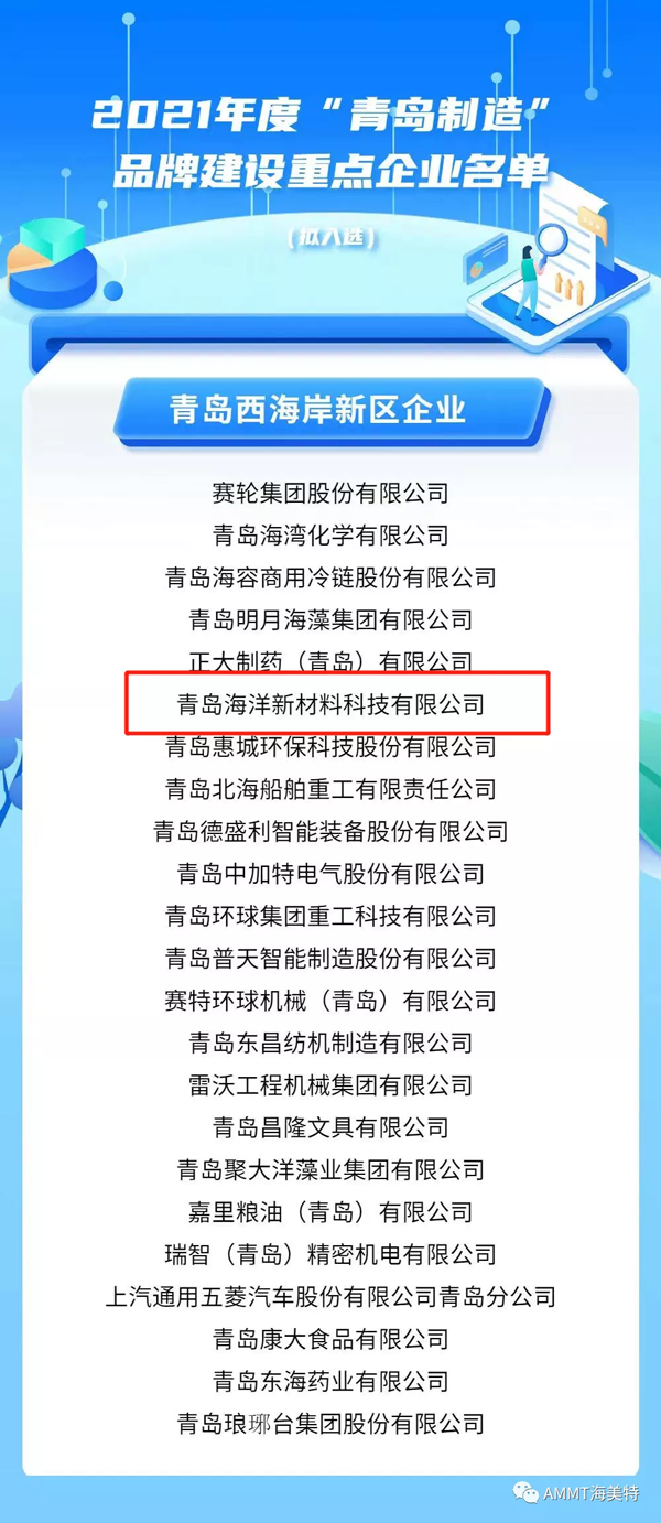 青島海洋新材料科技有限公司成功入圍市工信局組織開展的2021年度“青島制造”品牌建設(shè)重點(diǎn)企業(yè)名單。此次入選2021年度“青島制造”品牌建設(shè)重點(diǎn)企業(yè)名單共124家,其中西海岸新區(qū)入選企業(yè)23家。