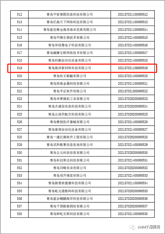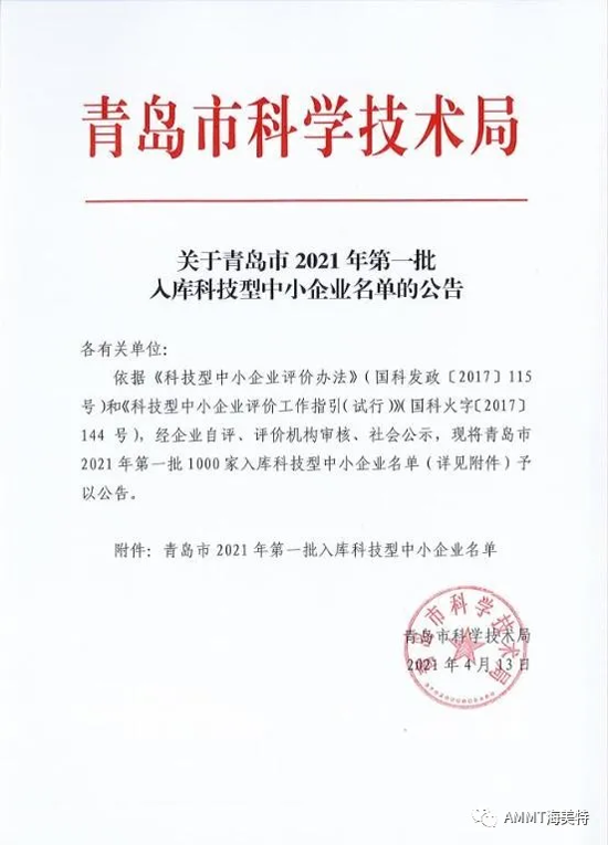 根據(jù)《科技型中小企業(yè)評(píng)價(jià)辦法》(國(guó)科發(fā)政[2017]115號(hào))和《科技型中小企業(yè)評(píng)價(jià)工作指引(試行)》(國(guó)科火字[2017]144號(hào))要求,青島海洋新材料科技有限公司經(jīng)政府有關(guān)部門批準(zhǔn)入庫(kù)成為“科技型中小企業(yè)”。這是我公司在提高企業(yè)自主創(chuàng)新能力、走創(chuàng)新持續(xù)發(fā)展道路上取得的又一喜人成果。