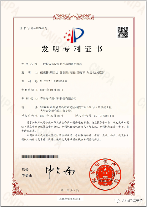 2021年6月18日,青島海洋新材料科技有限公司申請的“一種構(gòu)成多層復(fù)合結(jié)構(gòu)的阻尼涂料”發(fā)明專利獲得國家知識產(chǎn)權(quán)局授權(quán),授權(quán)專利號:ZL 2017 1 0973234.8。目前,公司共獲得國家授權(quán)專利32項,其中發(fā)明專利30項,實用新型專利1項,外觀設(shè)計專利1項。